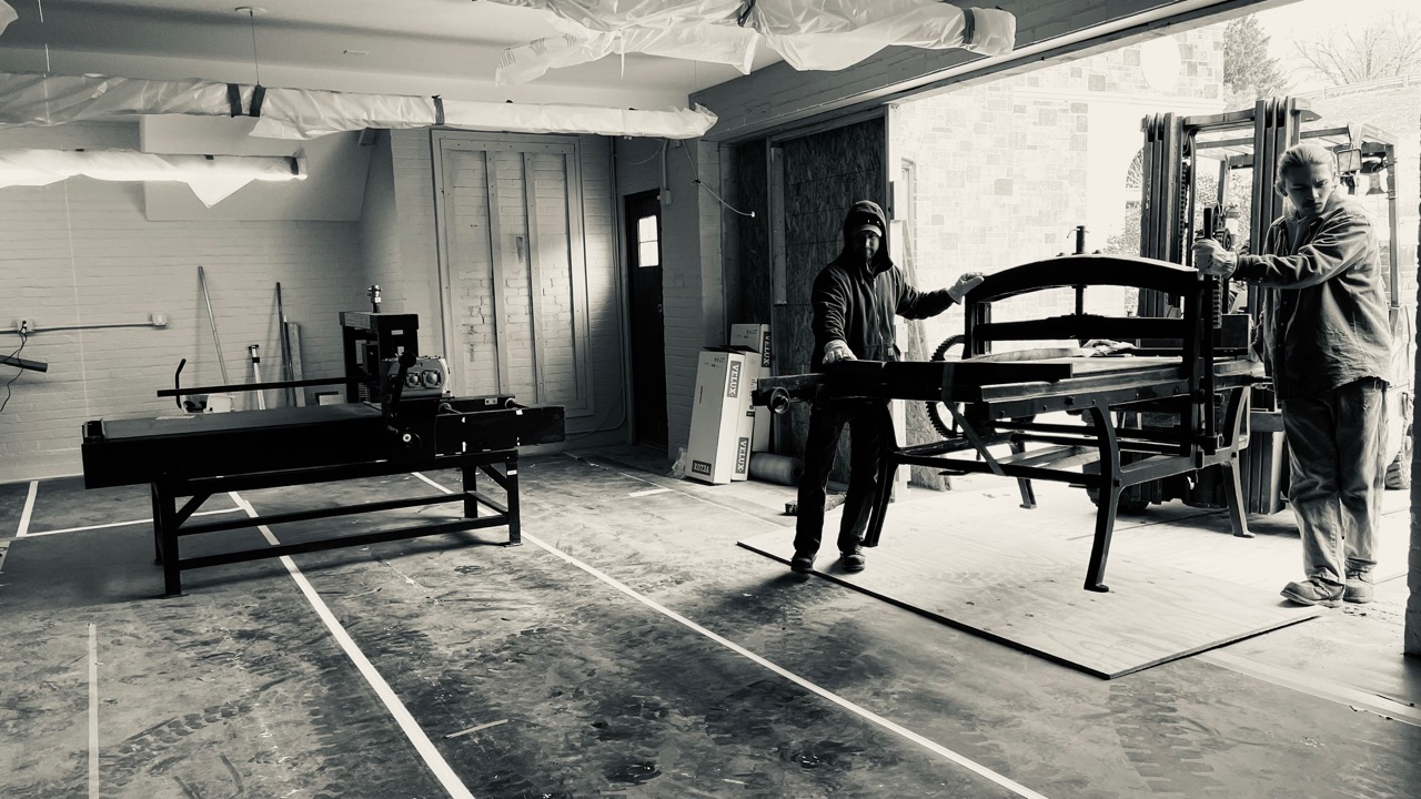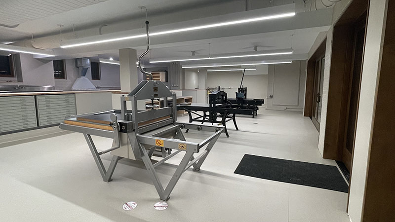 After many months in storage, our donated litho presses arrive back home into a nearly complete printmaking wing. Nov. 11, 2025.