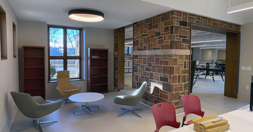 The intaglio print studio addition partitions have been removed. Lights in place. A view from the print study space. Early Oct. 2025.